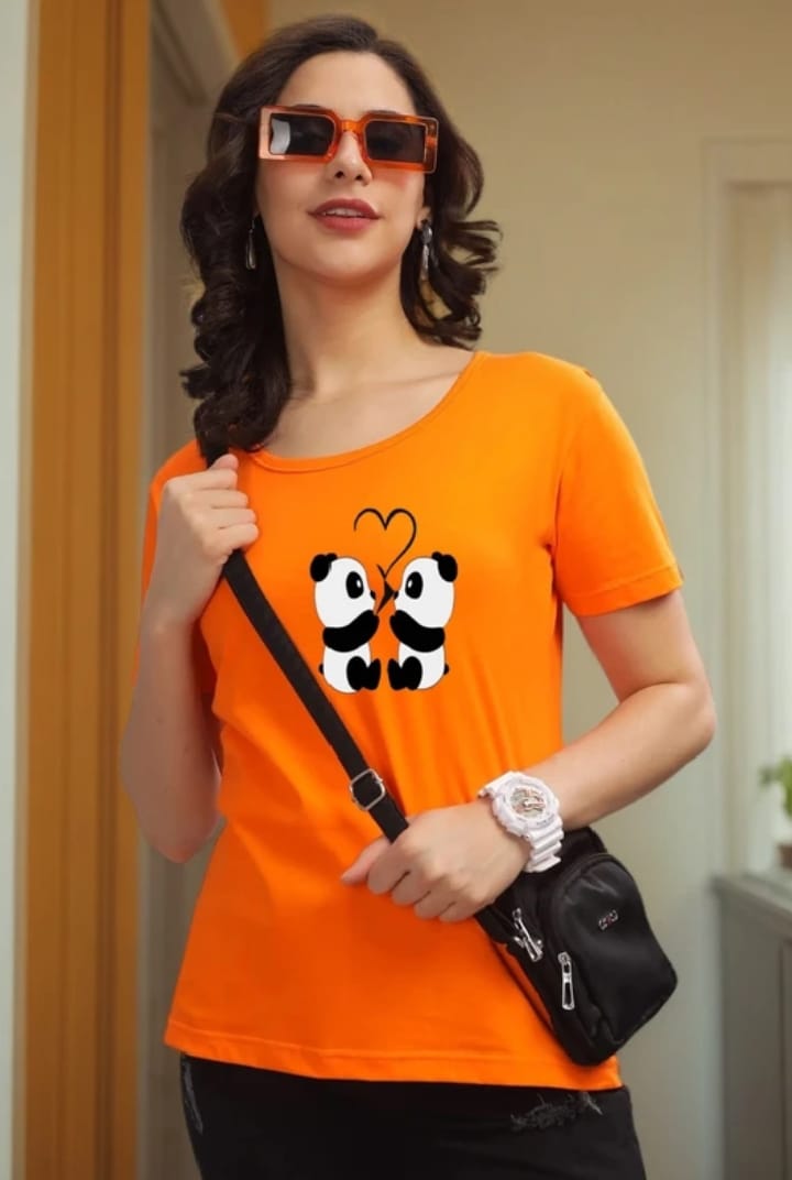 This bright and stylish orange t-shirt features an adorable panda print, giving it a fun and trendy look.